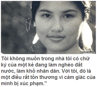Hãy nghe bà lý giải cho sự từ chối này: "Tôi không muốn trong nhà tôi có chữ ký của một kẻ đang làm nghèo đất nước, làm khổ nhân dân. Với tôi, đó là một điều rất tổn thương vì cảm giác của mình bị xúc phạm". Lời lý giải nghe thật giản đơn, nhưng mang ý nghĩa của một bản cáo trạng đanh thép đối với cái chế độ mà bà đang sống cùng, với ít nhất một kẻ lãnh đạo cấp cao. mà bà bất đắc dĩ phải làm kẻ phục tùng. Hãy thử suy nghĩ xem kẻ ấy đã lãnh đạo như thế nào để bà nói là "đang làm nghèo đất nước, đang làm khổ nhân dân". Không khó để hình dung, qua lý giải của bà, hình ảnh của một bạo chúa và một cường quyền, mà bà, nói riêng, và cả toàn dân VN, nói chung, đang phải chứng kiến và chịu đựng trong từng ngày sống.